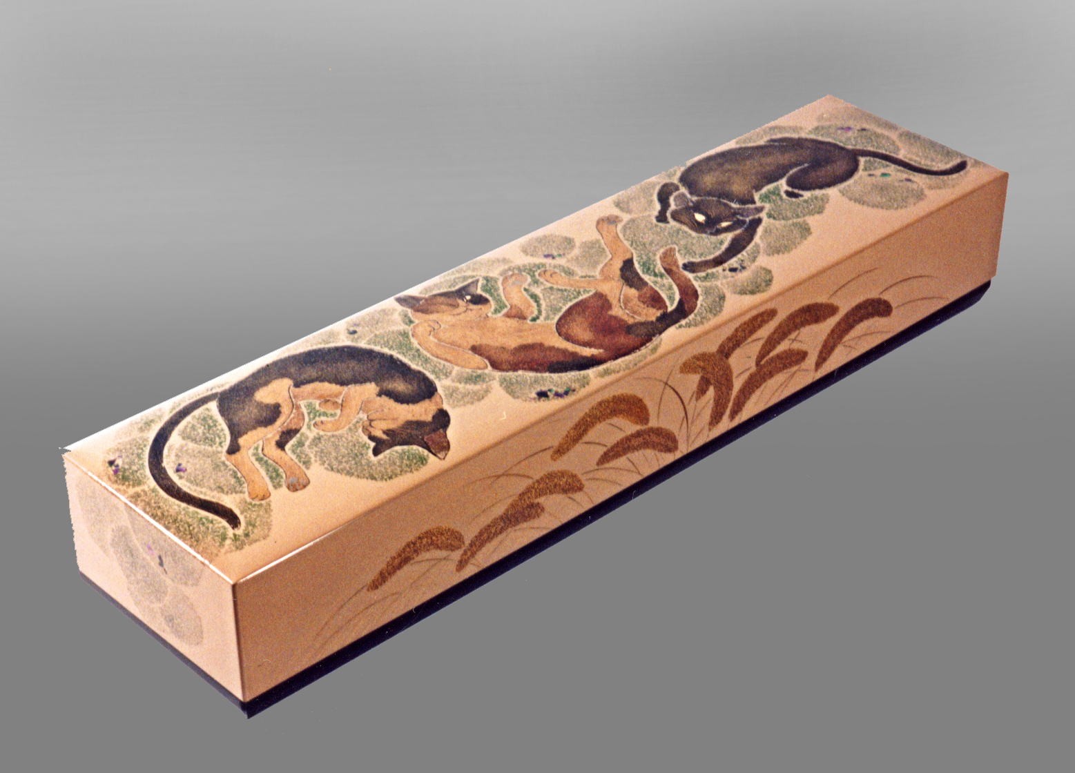 素材:桐材、総麻布がけ、本堅地、熱処理、研ぎ出し蒔絵