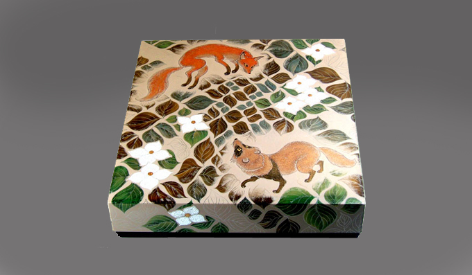 蒔絵色紙箱「一会」 昔より「狐と狸の化かし合い」と言われています。 山の中で両雄が出会ったら 先攻は狐,対する狸は、、、、、、