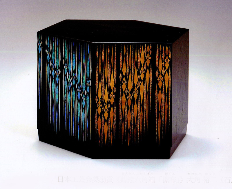 前面の左半分は螺鈿の伏せ彩色で日中の滝の流れを